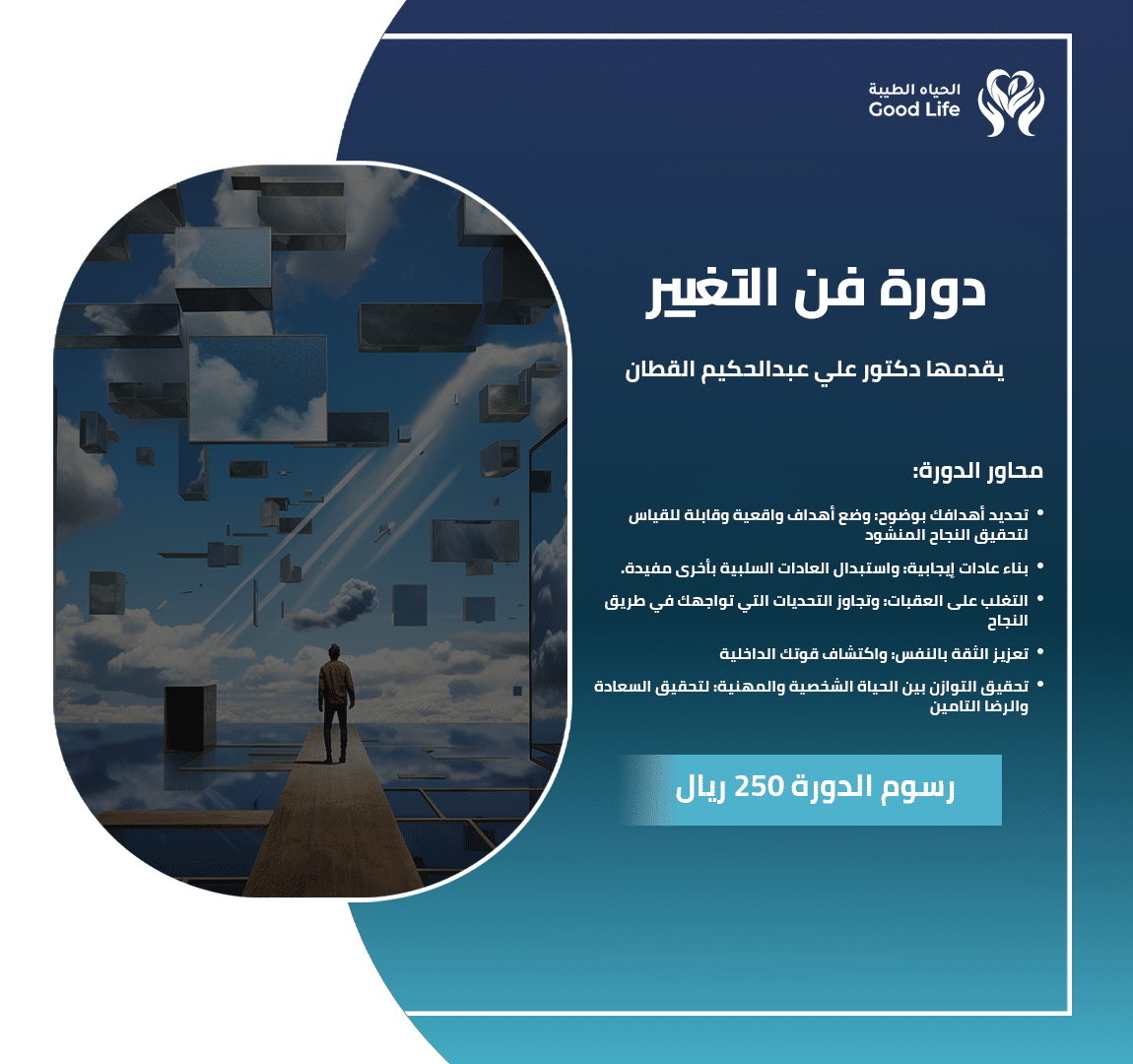 لو أنت شخص طموح تبحث عن تغيير حقيقي أو تطوير ذاتك دورة التغيير هي الحل الأمثل.. في هذه الدورة كل خطوة تحسب… وكل عادة إيجابية تتحقق!